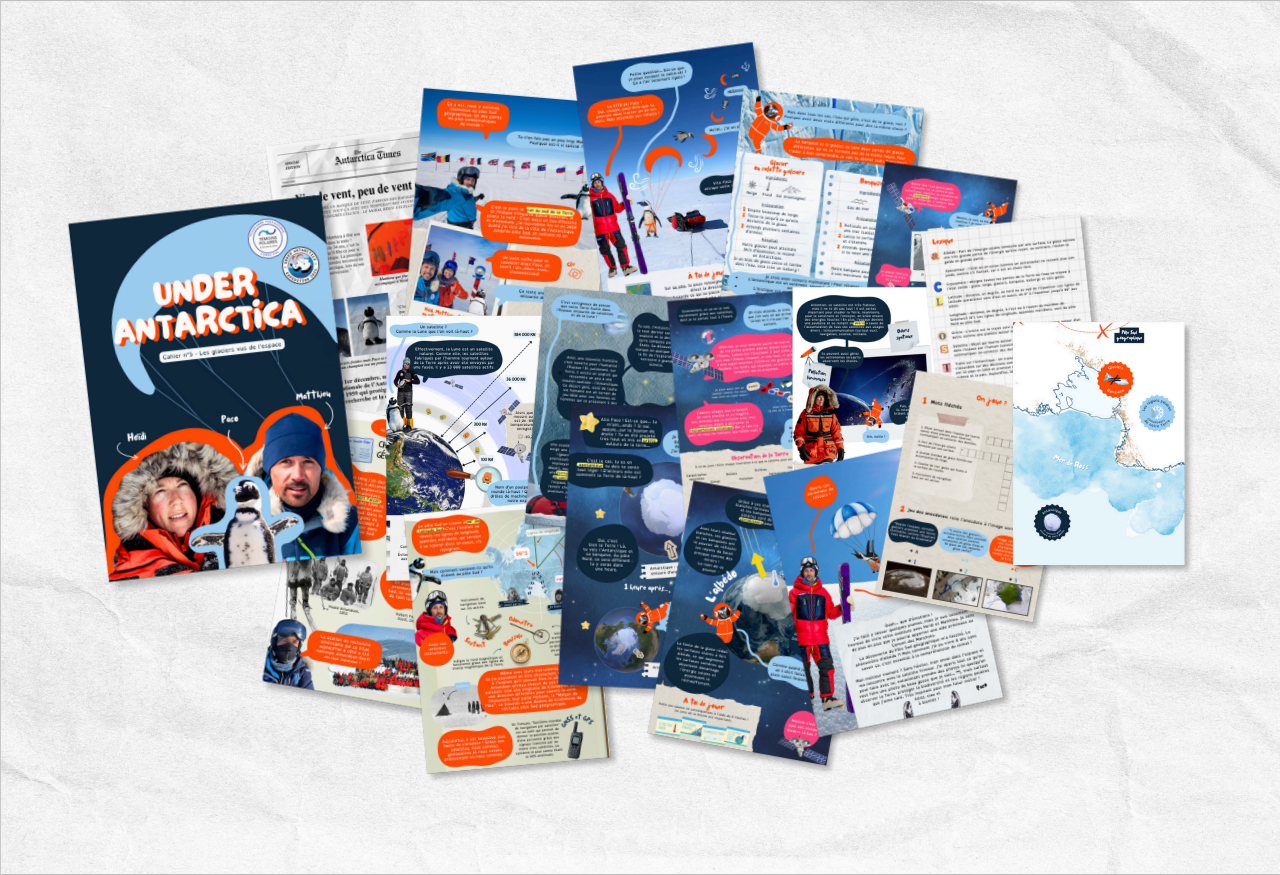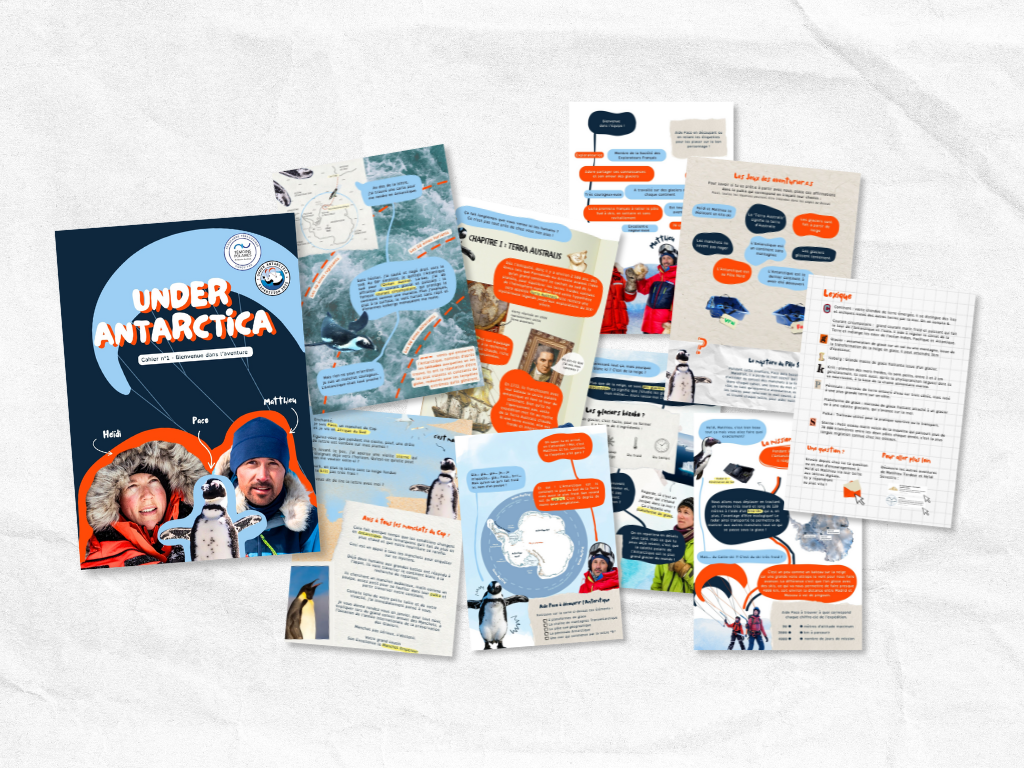 Alliant émerveillement, exploration et pédagogie, les cahiers pédagogiques vous transportent dans cette incroyable aventure à la découverte des mystères de l'Antarctique. Parcourez ce désert de glace, et apprenez davantage sur la région, son immense calotte polaire et le quotidien d'une expédition scientifique.